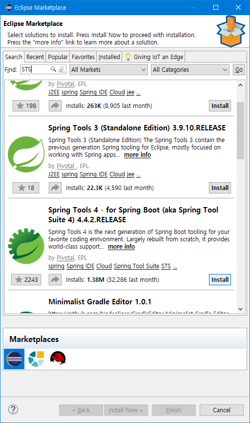스프링 공식 홈페이지에서 STS를 다운받아 설치한다면 개발에 필요한 플러그인 및 개발 도구가 이미 설치되어 있기 때문에 별도의 프럴그인을 설치할 필요가 업습니다. 그렇지만 우리는 이클립스부터 직접 개발환경을 구성하고 있기 때문에 마켓플레이스에서 STS플러그인을 설치해야 합니다.