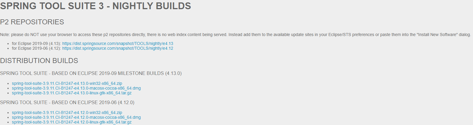 Spring Tool Suite 3 - Nightly builds p2 repositories Note: please do NOT use your browser to access these p2 repositories directly, there is no web index content being served. Instead add them to the available update sites in your Eclipse/STS preferences o