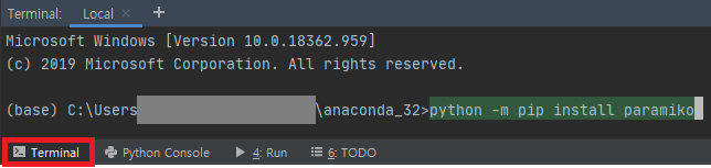 설치 명령어 : Terminal 에서 python -m pip install paramiko